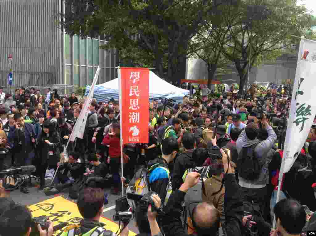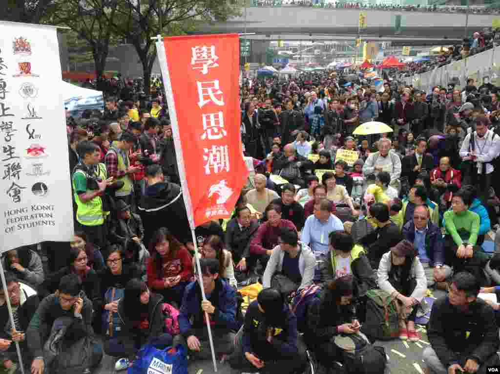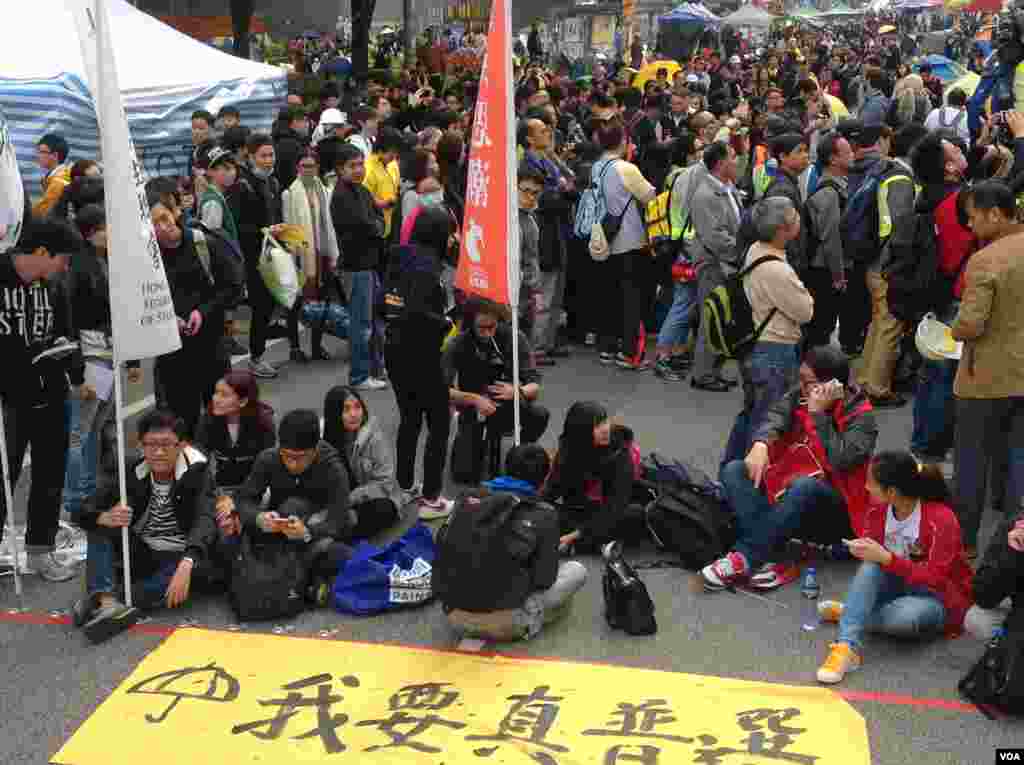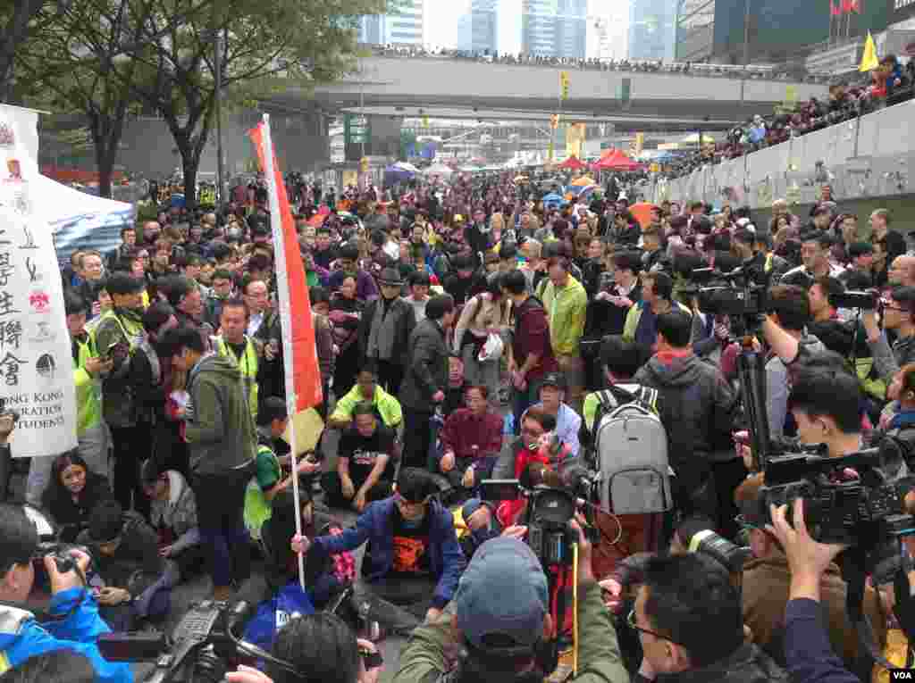 香港争取真普选的占领运动12月11日踏入第75天,这一天也是外界广泛关注的香港警方对金钟占领区展开全面清场的日子。在港府和警方呼吁占领者尽快离开,市民星期四尽量避免前往占领区的同时,上万市民星期三晚云集金钟,希望见证历史,而学联、学民思潮及多位泛民议员都通宵留守。 请看美国之音记者海彦在现场拍摄的照片。