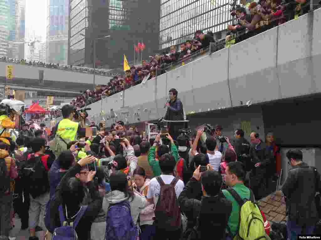 香港争取真普选的占领运动12月11日踏入第75天,这一天也是外界广泛关注的香港警方对金钟占领区展开全面清场的日子。在港府和警方呼吁占领者尽快离开,市民星期四尽量避免前往占领区的同时,上万市民星期三晚云集金钟,希望见证历史,而学联、学民思潮及多位泛民议员都通宵留守。 请看美国之音记者海彦在现场拍摄的照片。