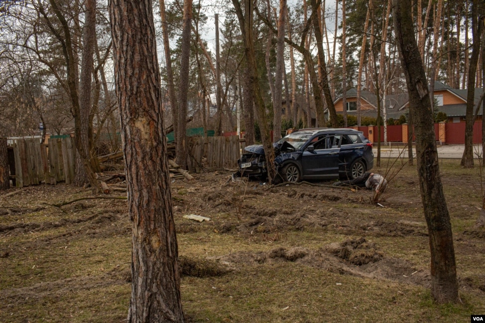 伊尔平的一处公园,一辆汽车旁躺着一具男性尸体。俄乌两军士兵在不远处的树林里交战。(2022年3月13日)